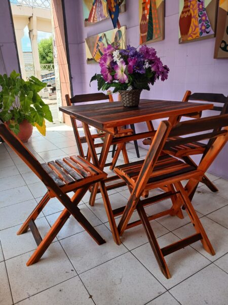 A mesa e cadeiras sao produzidas com madeira pura sem mistura, resistentes, ideial para bates, lanchonetes. restaurantes com cadeiras resistentes até 150kg.